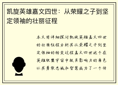 凯旋英雄嘉文四世:从荣耀之子到坚定领袖的壮丽征程